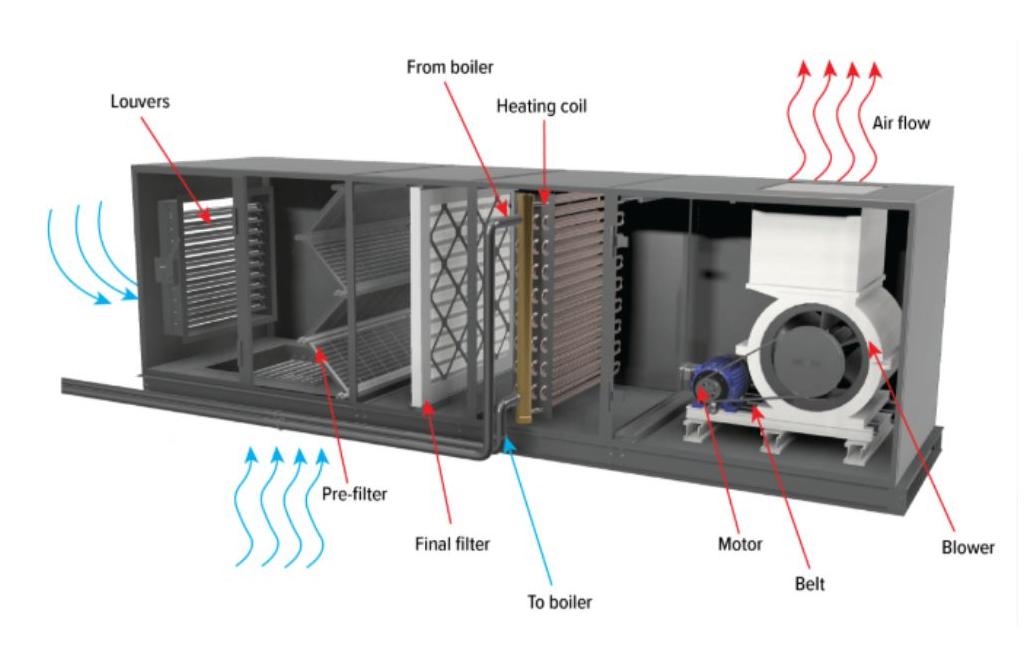An AHU conditions and distributes air while maintaining ventilation, temperature and indoor air quality.